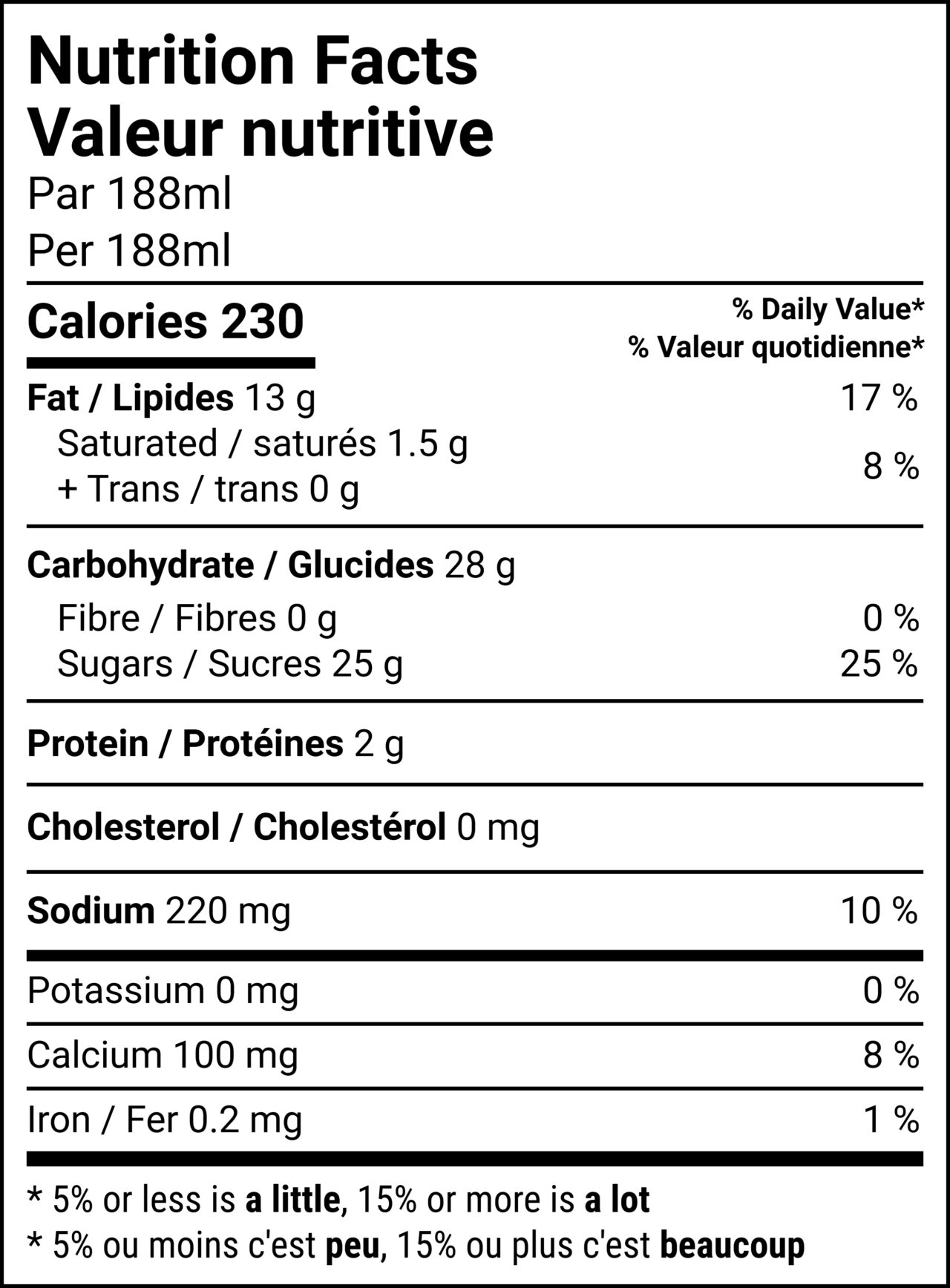 Ingrédients: Lait d’avoine, Sucre, Huile de tournesol, Dextrose, Pâte de Caramel, Protéine de pois, Stabilisant, Fibre végétale, Maltodextrine, Fleur de sel