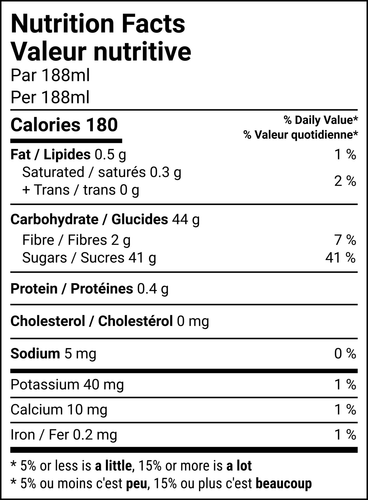 Eau filtrée, Framboises entières, Sucre de canne, Purée de lime, dextrose (sucre de maïs), Glucose, Stabilisant à crème glacée (gomme de guar), Jus de citron (frais)